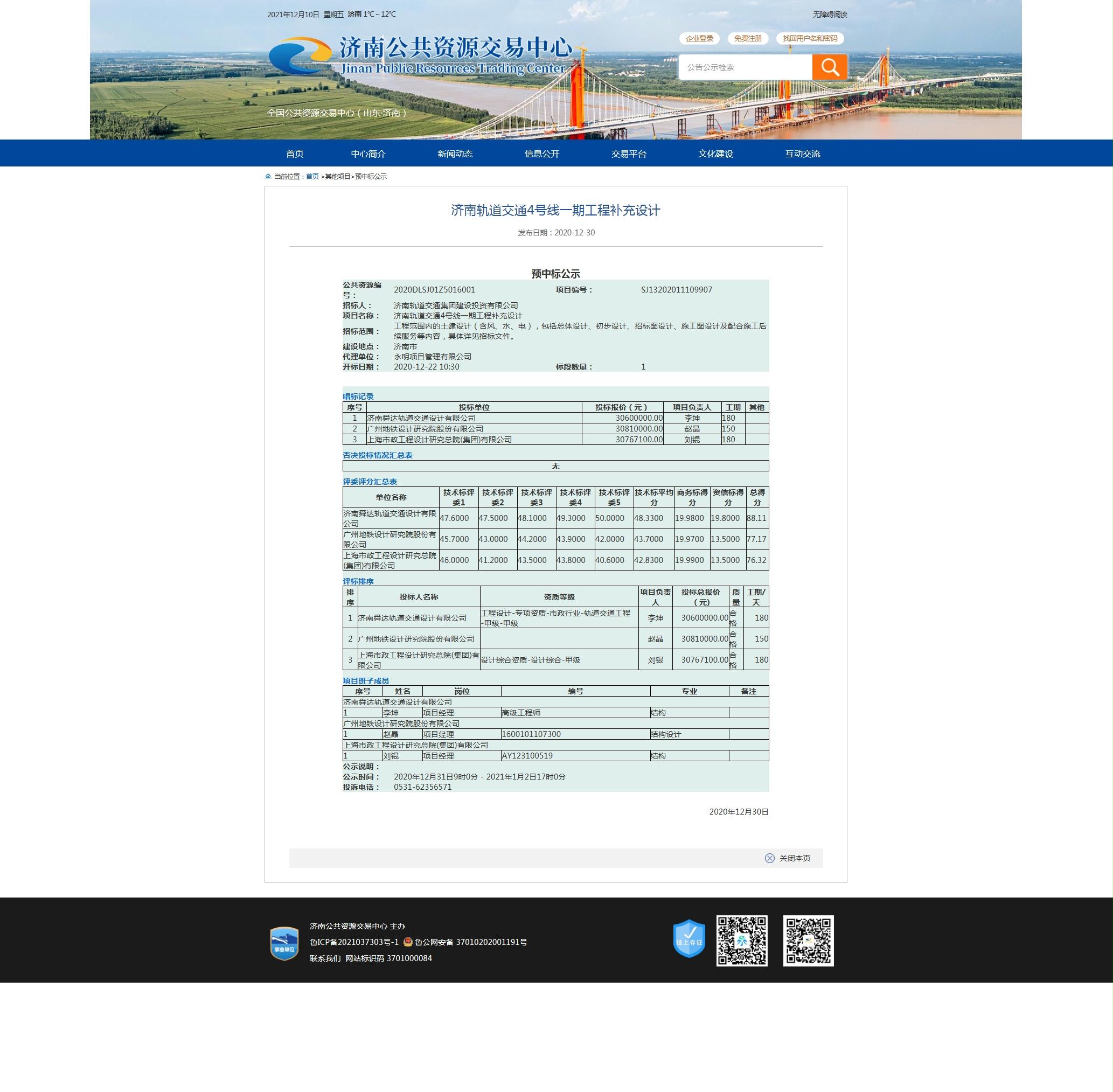 济南轨道交通4号线一期工程补充设计预中标公示