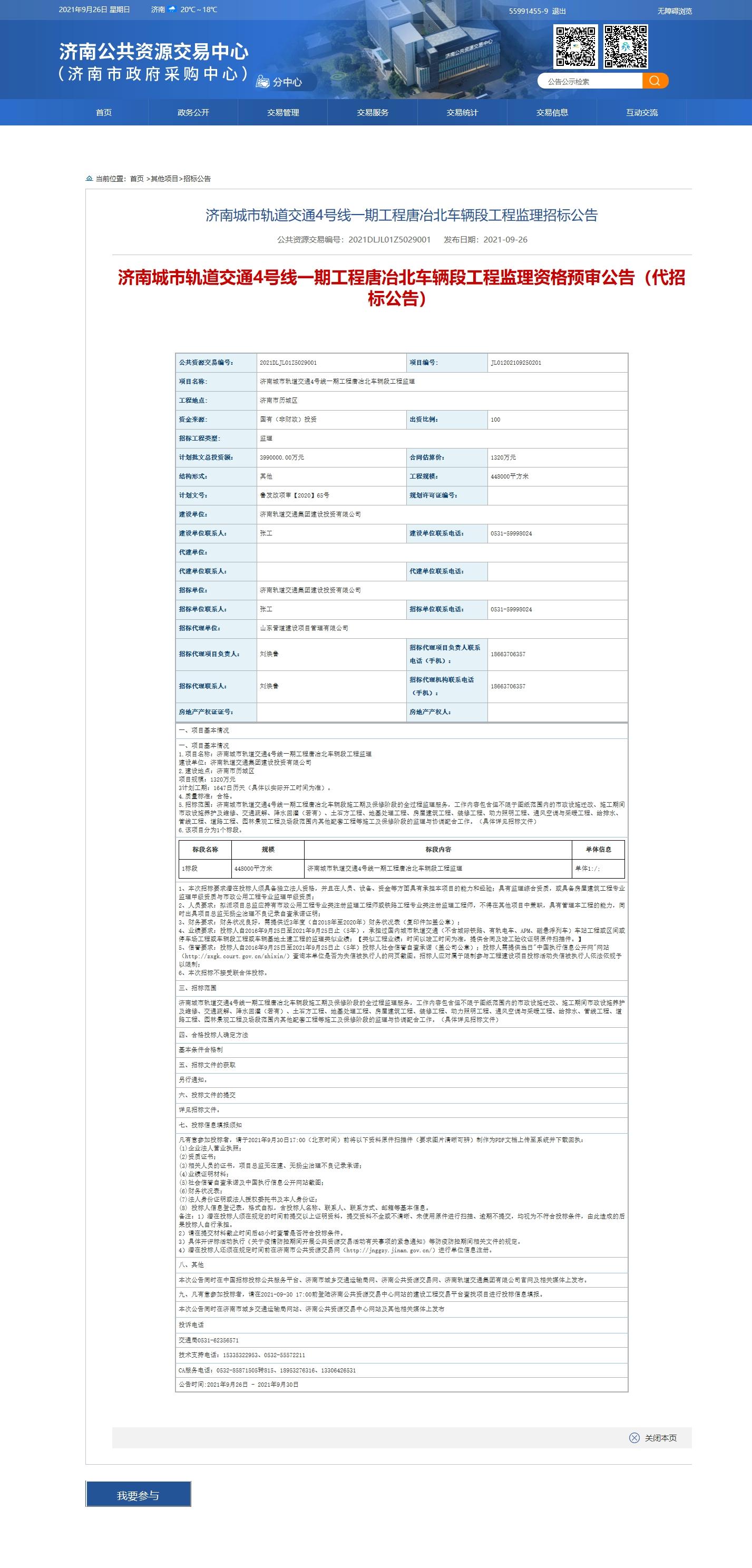 济南轨道交通4号线一期工程唐冶北车辆段监理招标公告