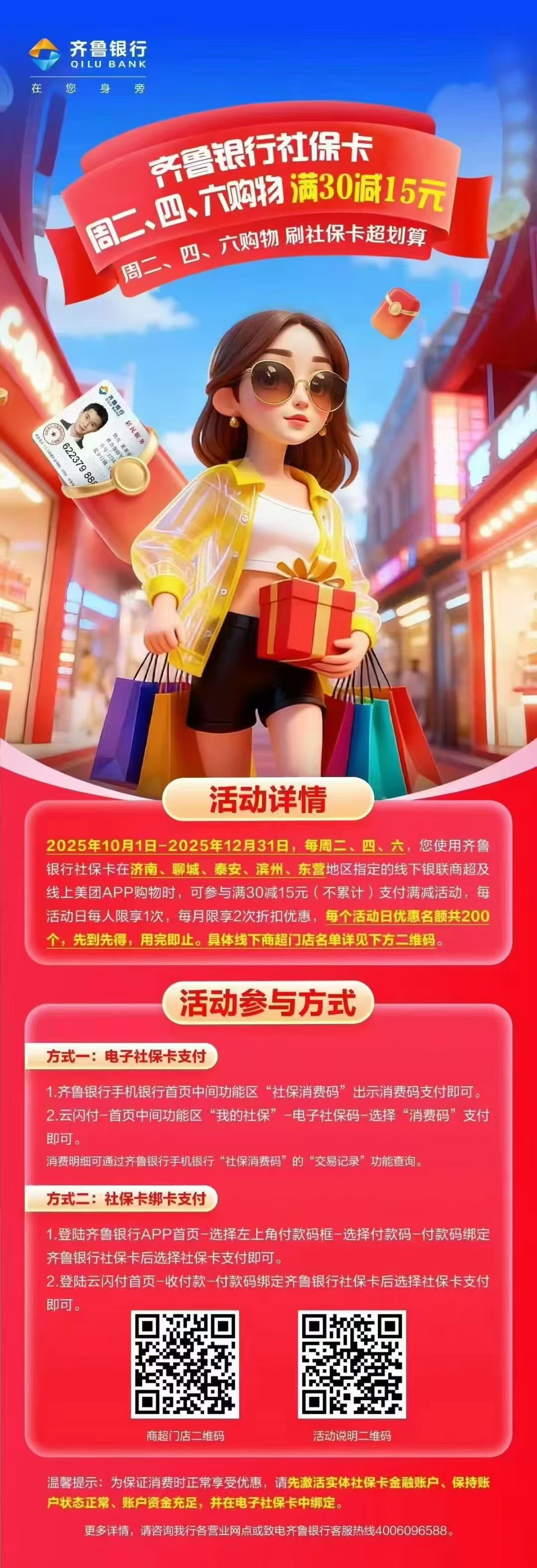 齐鲁银行社保卡周二、四、六购物满30减15
