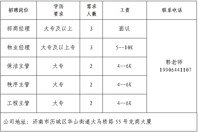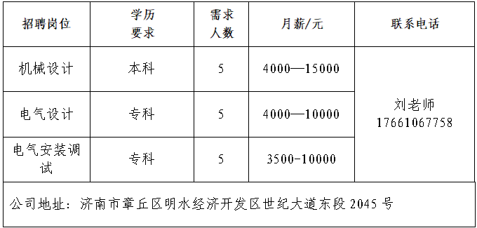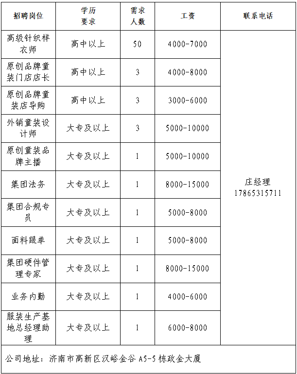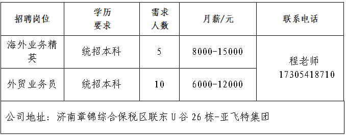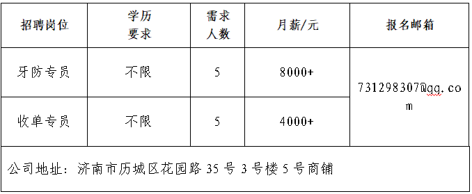 山东极兔供应链有限公司 极兔速递(J&T Express)是一家全球综合物流服务运营商,快递业务在东南亚和中国市场处于领先地位。 山东龙商供应链集团有限公司 2020年,山东龙商控股集团载梦启航,集团总部深植于济南历城华山之畔的龙商大厦,以大马桥路55号为原点,借山水城韵之势辐射全域,在济南“东强”战略的热土上,书写着有温度、有担当的商业传奇。 济南万通铸造装备工程有限公司 公司总部坐落于济南经济开发区,占地30000平方米,注册资金肆仟贰佰万元,是专业从事金属加工领域各种抛/喷丸处理设备,通风除尘、净化工艺及设备的技术性研究、设计制造公司。 山东亚飞特金属制品有限公司 公司成立于2006年,是集研发、生产、加工、销售、国际贸易于一体的大型公司。 领跑(山东)数控设备有限公司 公司是一家致力于智能装备研发、生产、销售和国际贸易的智能制造装备制造商。公司生产位于山东德州,拥有独立的床身铆接车间、机加工车间、钣金生产车间、喷涂车间、装配调试车间,占地面积20000平方米。 山东鸿天投资集团有限公司 总部坐落于济南市高新区汉峪金谷,拥有服装贸易公司、服装生产加工基地、技术研发中心、国外办事处等23家全资子公司,现有员工人数4000余人,是一家集设计研发、3D虚拟样衣、精益化生产、检品后整为一体的服装ODM供应链集团公司。 济南可恩口腔医院有限公司历城口腔门诊部 可恩口腔集团创立于2006年,是全国首家在新三板挂牌上市以口腔医疗为主题的公司,目前已经发展成为遍及全国8座城市,拥有27家连锁机构的连锁口腔医疗集团。 济南达利食品有限公司 公司是中国民营企业500强,主要生产食品饮料等。 企业报名参加招聘,求职者咨询更多招聘岗位信息请致电市人力资源市场: 济南市人力资源市场 (地址:历城区七里河路2-2号) 联系人:王老师 联系电话:0531-61317807
