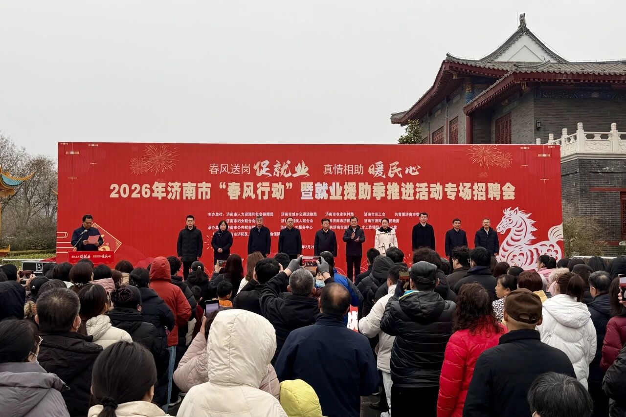 2月26日,济南市2026年“春风行动”暨就业援助季推进活动在济阳区九曲黄河万里情南广场举办。活动以“春风送岗促就业 真情相助暖人心”为主题,聚焦农村劳动者、高校毕业生、灵活就业人员等重点群体和广大用工企业需求,搭建精准对接平台,畅通就业渠道。市委组织部副部长,市人力资源社会保障局党组书记、局长宁延学,济阳区委常委、副区长张本才参加活动并致辞。市人力资源社会保障局党组成员、市公共就业服务中心主任王振群主持活动。市交通运输局、市农业农村局、国家统计局济南调查队、市总工会、团市委、市妇联、市残联等有关部门负责同志参加活动。
