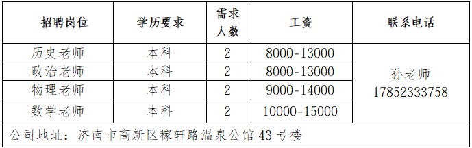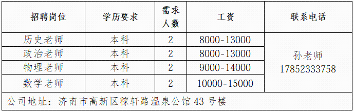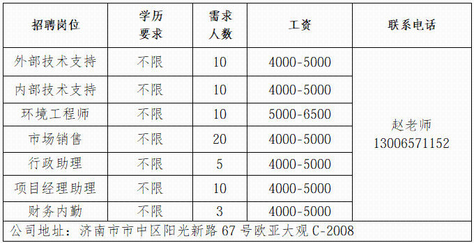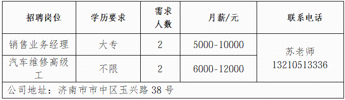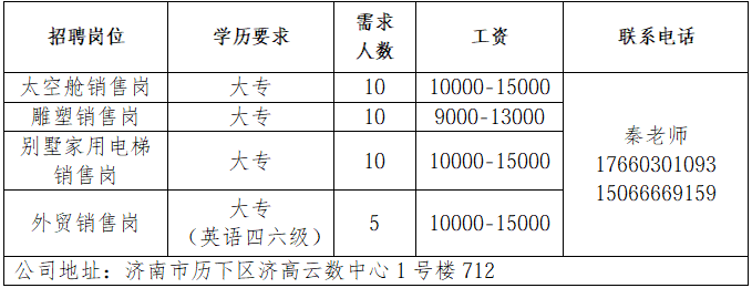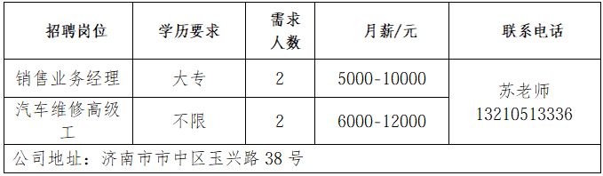 济南书径同舟教育咨询有限公司 成立于 2007 年,是济南高新区正规民办托管学校,专注初高中学生托管与文化课辅导。 济南鲁岳汽车服务有限公司 济南鲁岳汽修厂是一家有着20年汽车维修的公司,是济南市一类汽车维修行业资质,山东省和济南市公务车定点维修单位。 山东三友控股集团有限公司 山东三友控股集团有限公司是国内大型集设计研发、制造销售、文化旅游、运营管理、配套服务于一体的综合性文旅企业。 山东鼎信立业贸易有限公司 山东鼎信立业公司成立于2009年,是一家从事钢材营销的钢材实业公司。 济南雪航环保科技有限责任公司 济南雪航环保科技有限责任公司成立于2010年,是集研发、生产、销售、服务一体的高新企业。 企业报名参加招聘,求职者咨询更多招聘岗位信息请致电市人才市场: 济南人才市场 (地址:经十路22399号和谐广场东200米) 联系人:胡老师 联系电话:0531-85800632